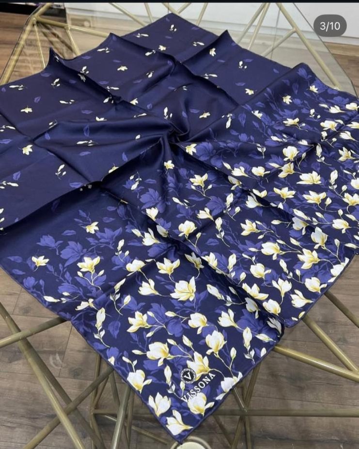 Kadınlar için koyu mavi, çiçek desenli, dökümlü stilde sentetik kumaştan şal. Klasik Paris tarzını yansıtıyor.