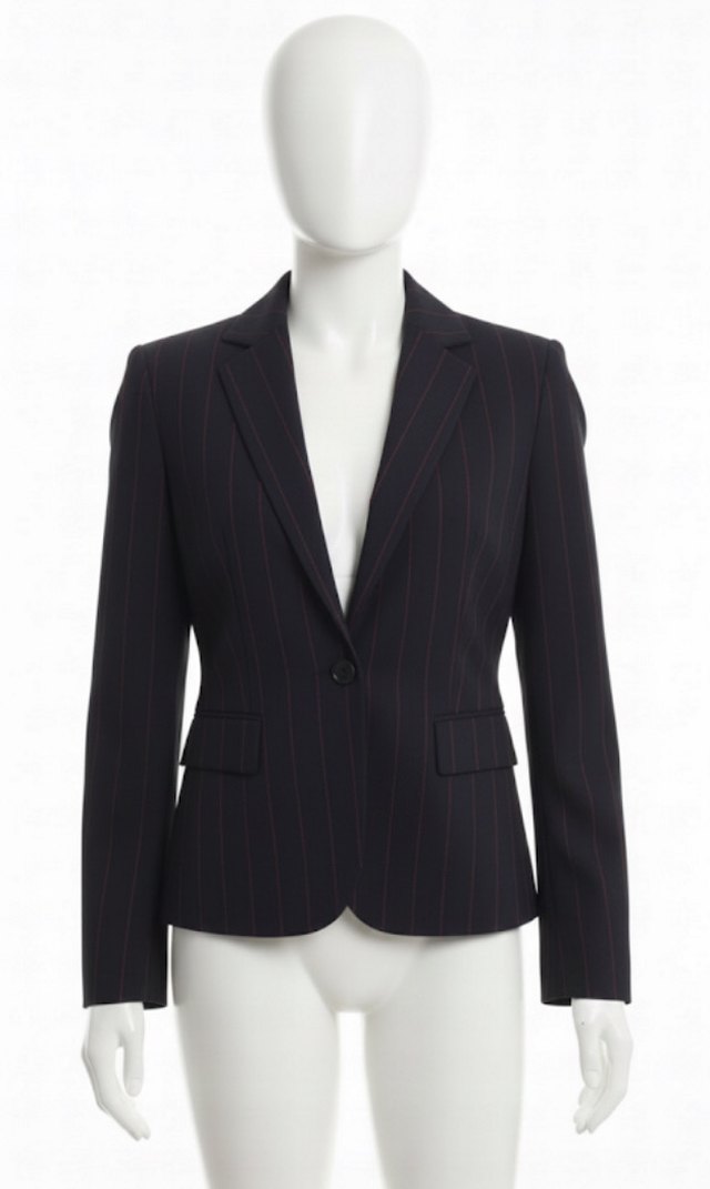 Siyah çizgili kadın blazer, düğmeli ve kesik yakalıdır. Uzun kollu, normal kesim ve sentetik kumaştan üretilmiştir. Ofis için klasik ve çağdaş tarzda uygundur.