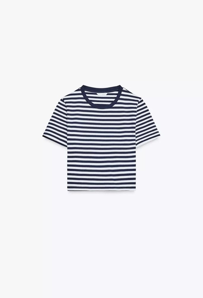 %100 pamuk Kadınlar için kısa kollu, yuvarlak yakalı, pamuklu ve vücuda oturan kesime sahip. Hafif lacivert çizgili deseniyle rahat sokak stili için uygun.