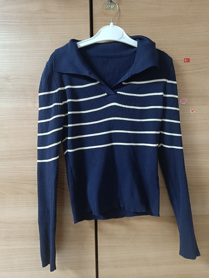 Lacivert ve beyaz çizgili, uzun kollu, yakalı ve vücuda oturan örgü triko kazak. Günlük kullanım için uygun şık bir parça.