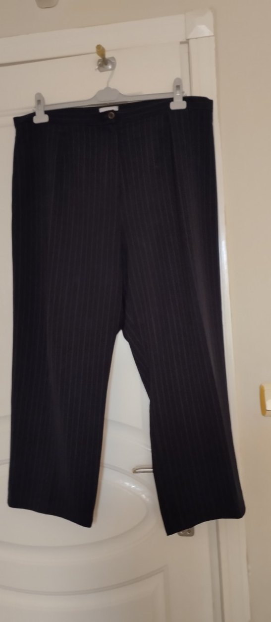 Kadın lacivert kumaş pantolon, regular fit ve midi boydadır. Piliseli detayları ve çizgili deseniyle iş ortamına uygundur. ölçüsü resimde bakarak alım yapınız