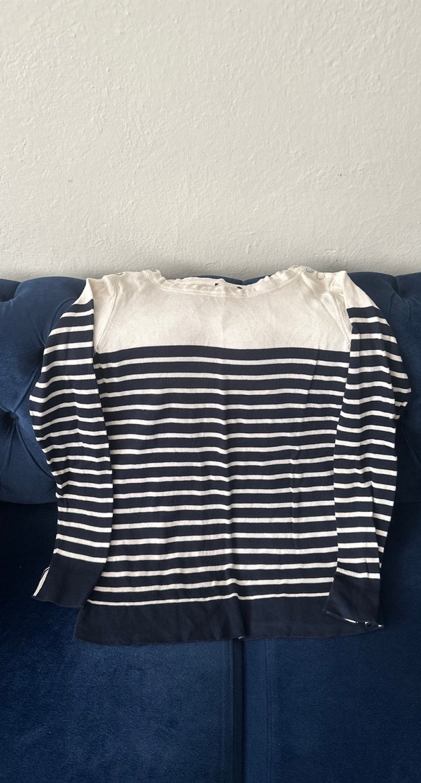 Tekne yaka ve uzun kollu, lacivert çizgili, sentetik kumaştan yapılmış, vücuda oturan normal uzunlukta kazak. Sokak modasına uygun hafif fırfır detaylıdır. İki koltuk arası 47 cm
