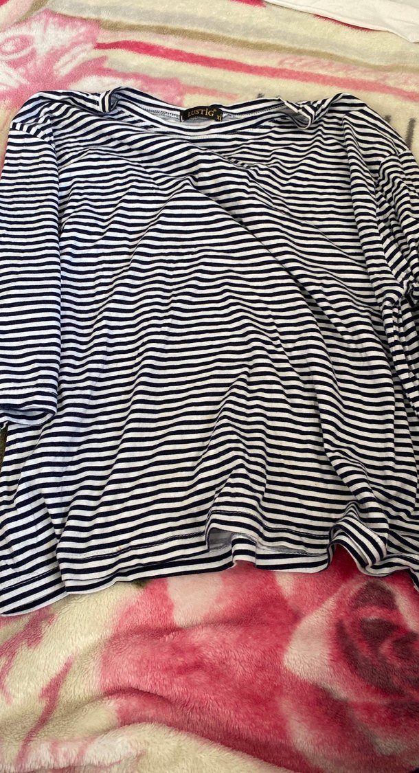 Lacivert çizgili, uzun kollu, tekne yaka kadın bluz. Pile detaylı, bol kesim ve sentetik kumaştan, gündelik sokak tarzına uygun.