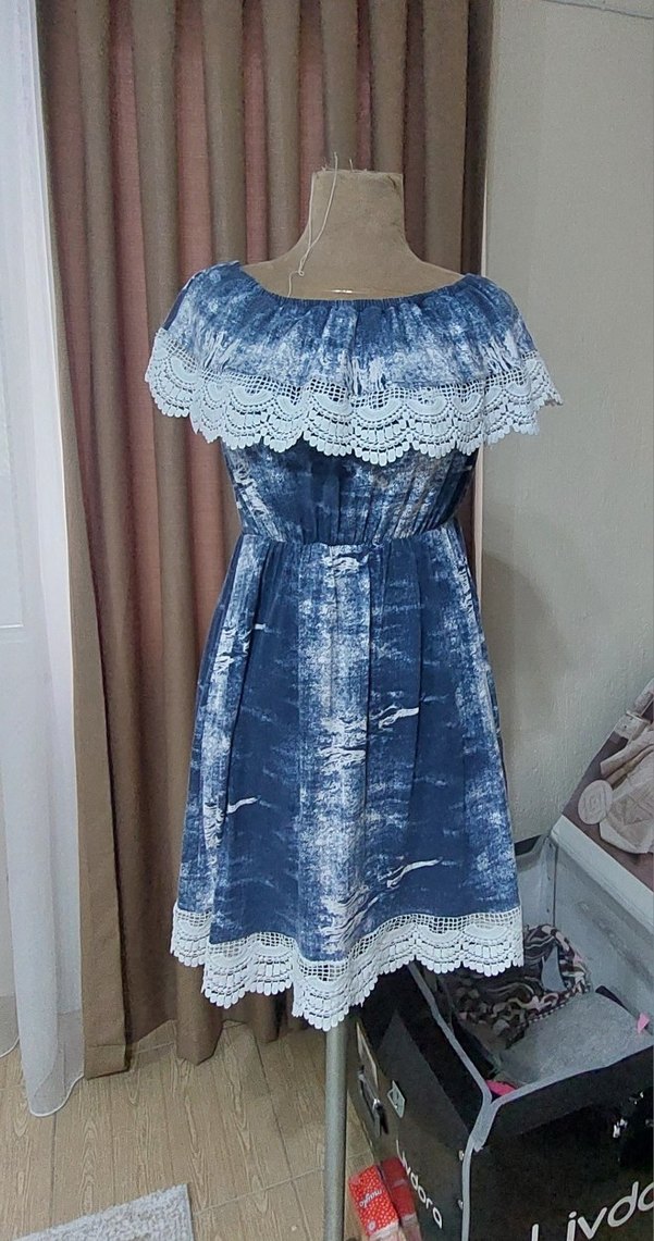 Lacivert kot desenli kumaştan, beyaz dantel detaylı, askısız ve kolsuz, bol kesim midi boy bohem elbise.