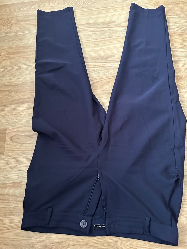 Kadınlar için lacivert, dar kesim ve midi boyda, fermuarlı kumaş pantolon. Düz ve sportif tarzda, günlük kullanıma uygundur.