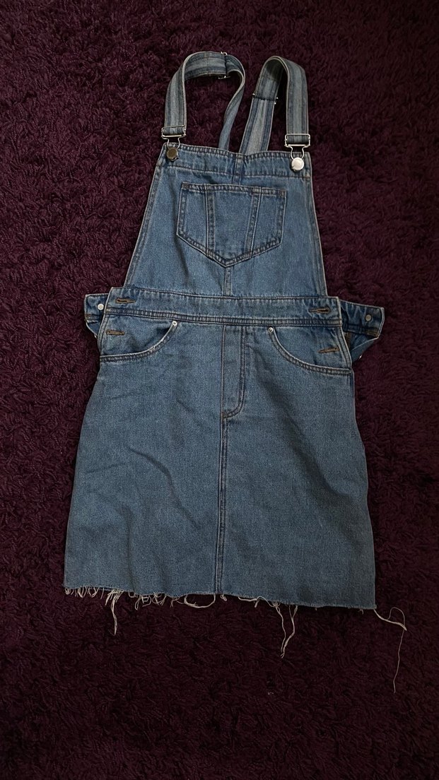 Askılı, tokalı lacivert denim midi bahçıvan elbise, bağlama deseni ve kayıksırtı yakaya sahip, rahat kesim ve günlük sokak stili için uygun.