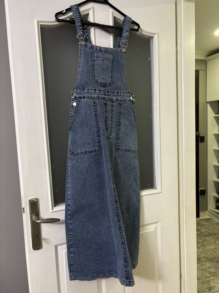 Lacivert denim kumaştan, askısız yaka ve tokalı askılara sahip, rahat kesim midi boy kadın salopet.