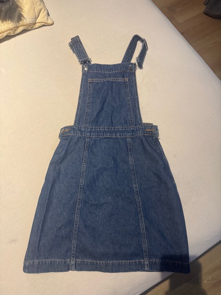 Lacivert denim kumaştan, askılı ve tokalı, vücuda oturan midi uzunlukta kadın salopet. Günlük kullanıma uygun, sade ve rahat tarzda.