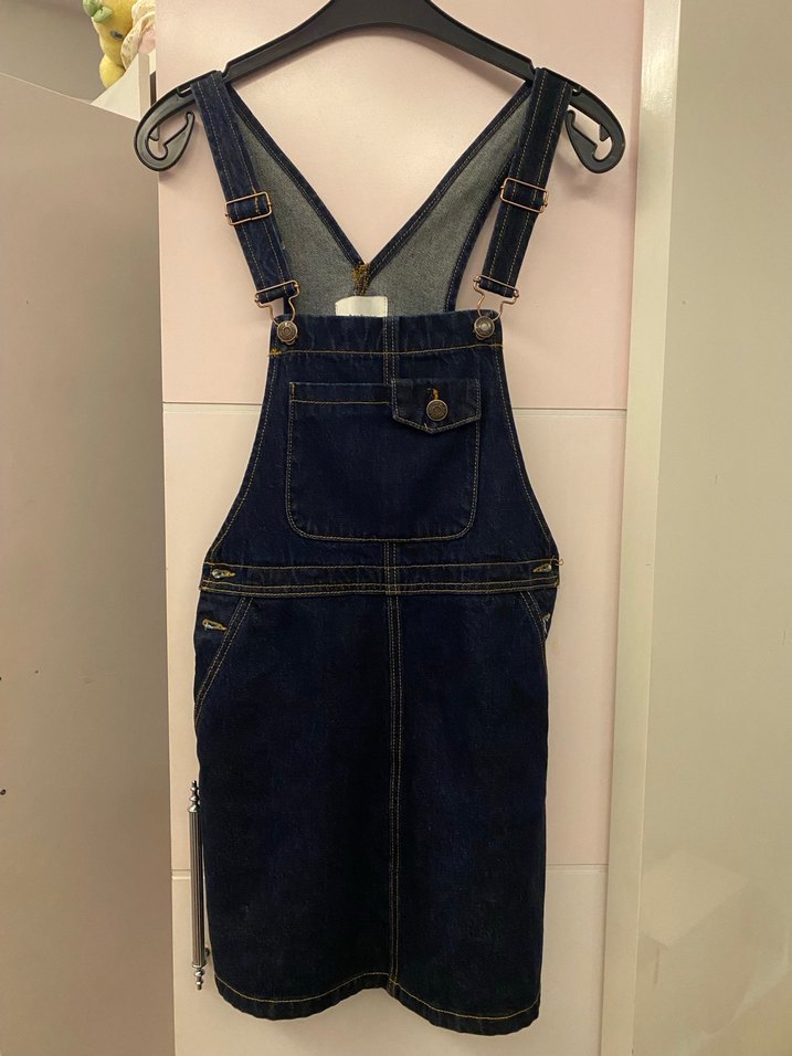 Lacivert denim askılı, tokalı ve bele oturan midi uzunlukta kadın salopet. Sokak tarzı için uygundur.