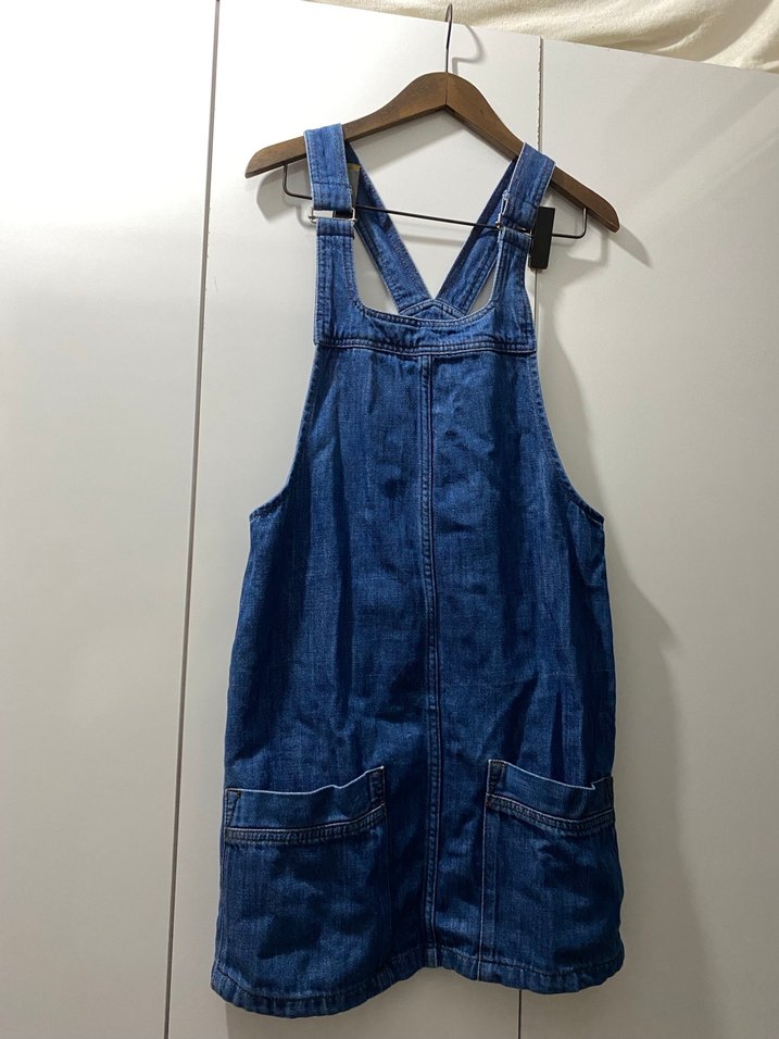 s-m Lacivert denim kumaştan, askılı ve tokalı, bol kesim kısa salopet. Straplez yaka ve ön ceplere sahip, günlük rahat stil için uygun.