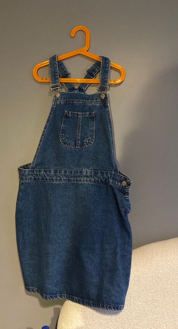 Ayarlanabilir tokalı askıları ve ön cebi olan, rahat kesim lacivert denim midi tulum, günlük sokak stili için uygun.