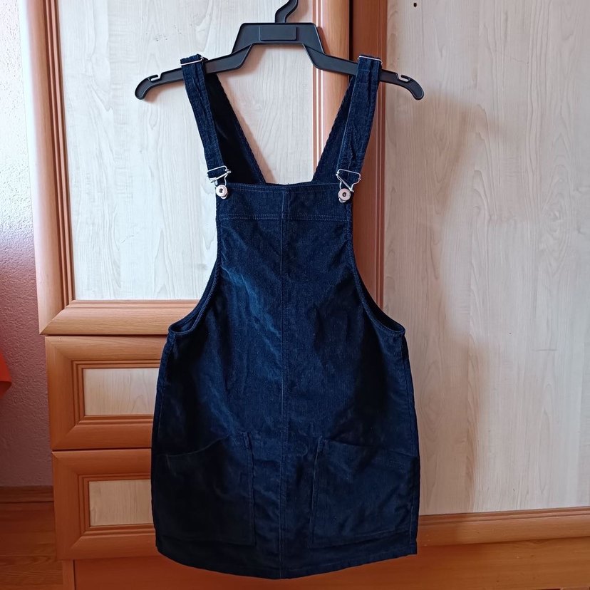 Lacivert kot kumaştan, ayarlanabilir tokalı askılara ve halter yaka tasarımına sahip, vücuda oturan kısa tulum elbise. Günlük kullanıma uygun.