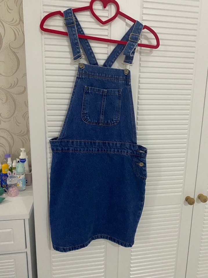 Lacivert denim kumaştan, askılı ve tokalı ayarlanabilir kayışlara sahip, önden cep detaylı, mini boyda ve fitted kesim tulum.