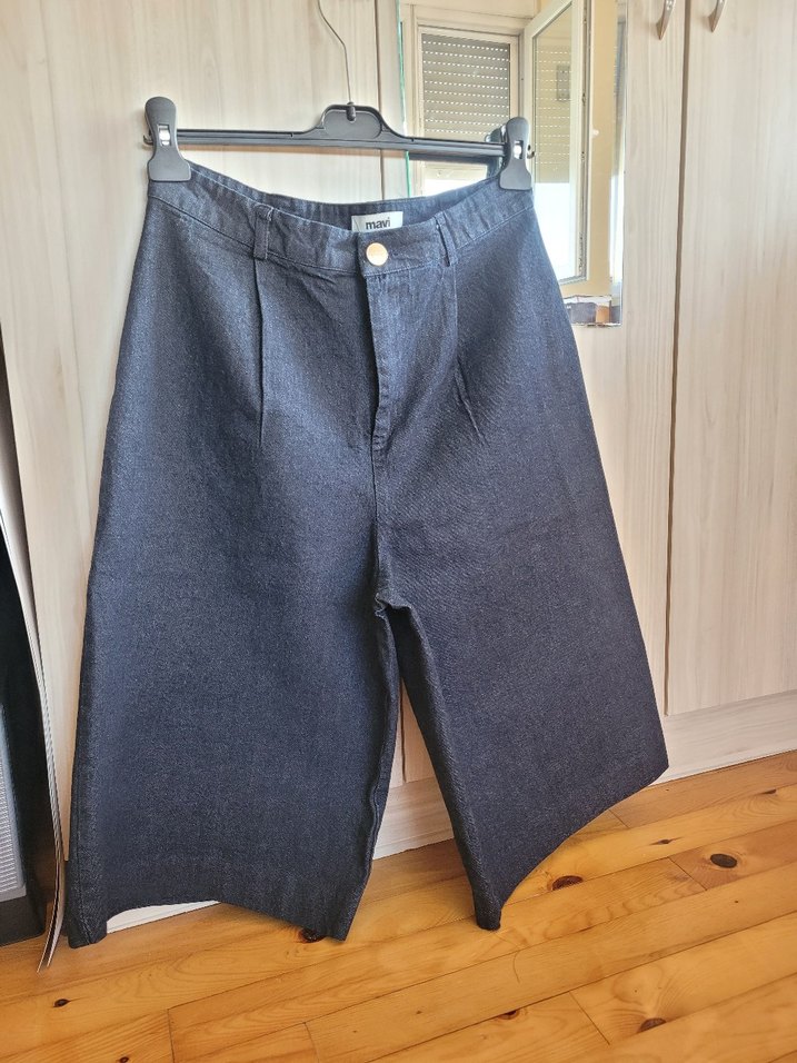 Kadınlar için lacivert denim bermuda şortlar, bol kesim ve pile detaylarına sahiptir. Kısa boyda, sade ve günlük kullanıma uygun bir tarza sahiptir. Boy:70 cm
