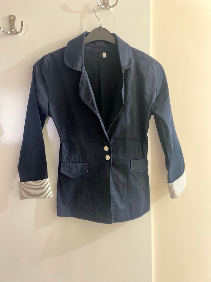 Lacivert denim kumaştan yapılmış, düğmeli ve yakası kesik olan kadın blazer ceket. Uzun kollu, iç kısmı çizgili manşet detaylı, normal kesimdir.