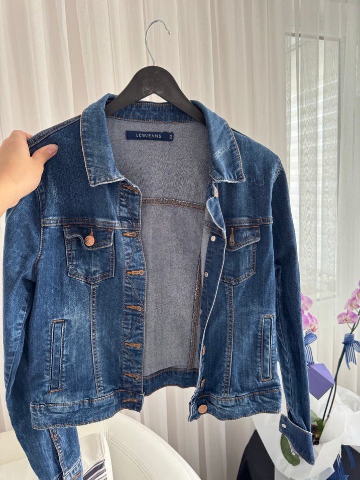 Lacivert renkli, düğmeli, uzun kollu ve kesimli kadın denim ceket, günlük ve sokak stiline uygun.