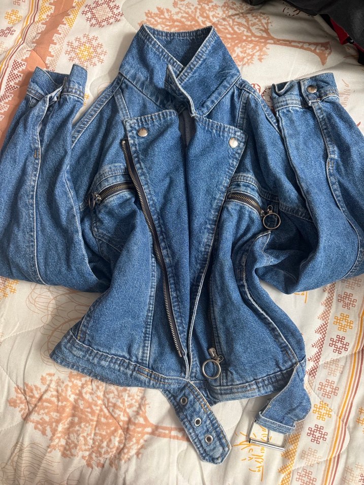 Lacivert denim kumaştan, fermuarlı ve salaş kesim kadın ceket. Notlu yaka ve askılı kollara sahip, günlük kullanıma uygun grunge punk tarzında.