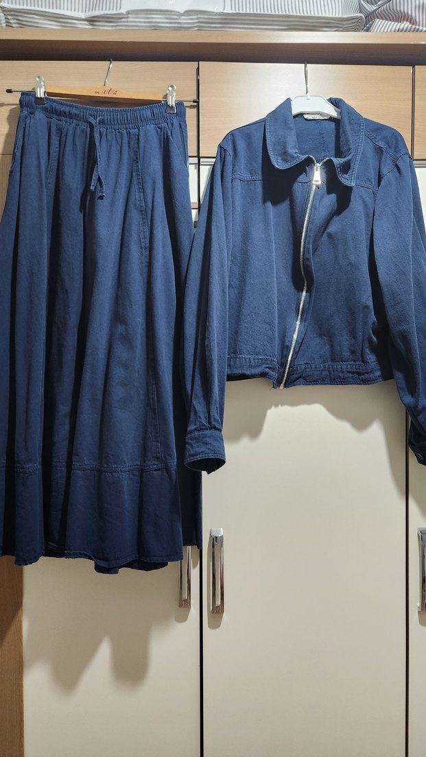 Kadınlar için koyu mavi denim ceket, fermuarlı ve yakalı, bol kesim uzun kollu. Elastik bel midi etekle uyumlu, günlük rahat kullanım için uygun. Pamuk ince trenç kumaşından. Artık giymediğim için satıyorum. Hoops store'ın ürünü.