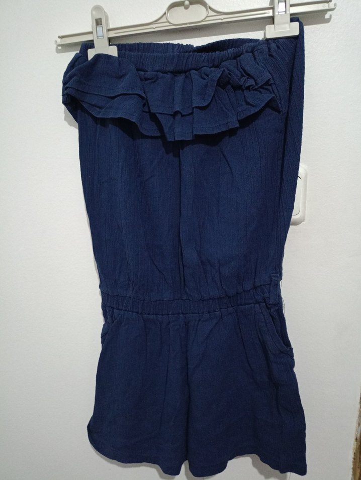 Lacivert denim kumaştan, fırfırlı straplez yaka ve bol kesim tulum. Midi boy ve kolsuz, günlük rahat stil için uygun.