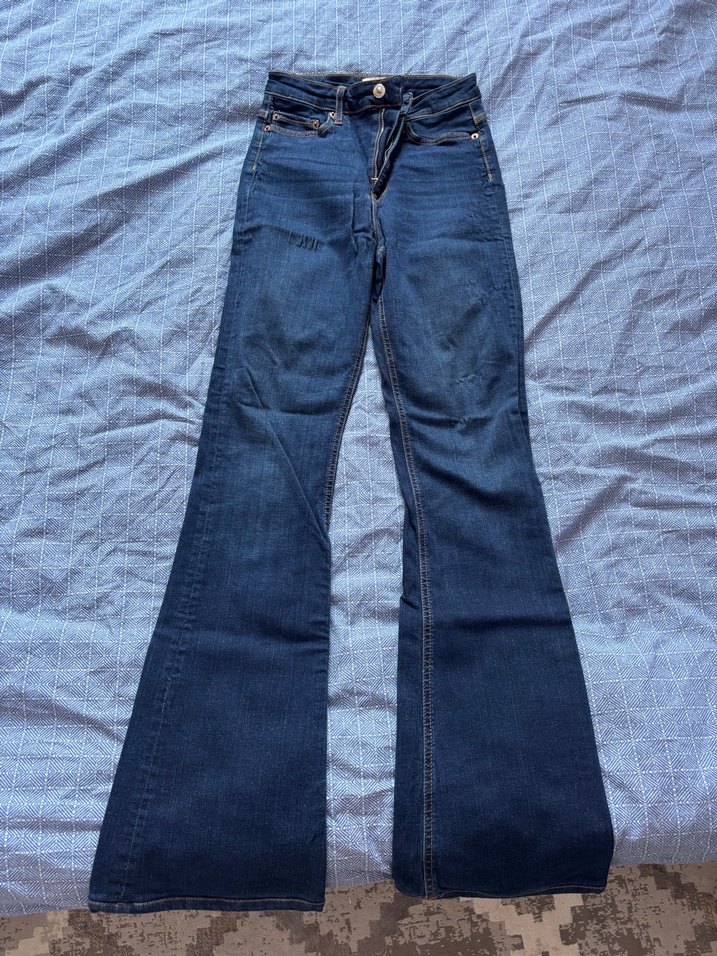 Lacivert renkte, normal boyda ve geniş paçalı, kemerli detaylı kadın kot pantolon. Günlük kullanıma uygun rahat tasarım.