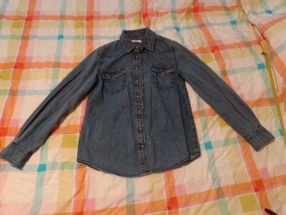 Lacivert denim kumaştan, düğmeli, uzun kollu, yakalı, bol kesim ve normal boyda kadın gömleği. İki cep ve desensiz tasarıma sahiptir.