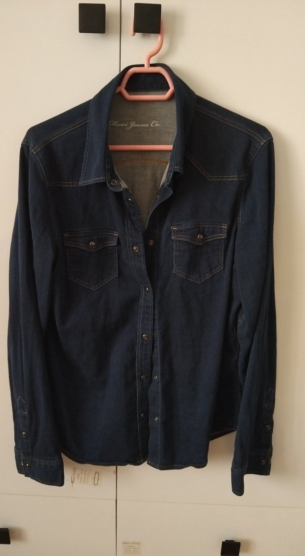Fitted kesim, uzun kollu lacivert denim gömlek, çıtçıtlı ve notlu yaka detaylıdır. Normal midi boyda, günlük kullanıma uygundur.