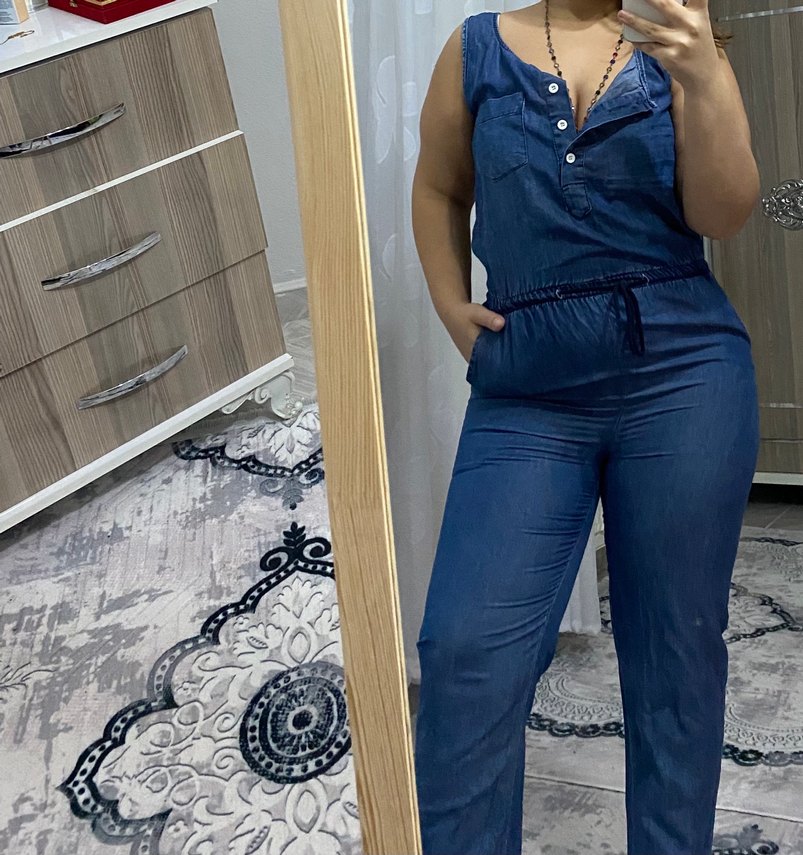 Kadınlar için lacivert denim kumaştan, V yaka ve kolsuz, kemerli, bol kesim uzun tulum. Parlak görünümlü, günlük sokak stiline uygun.