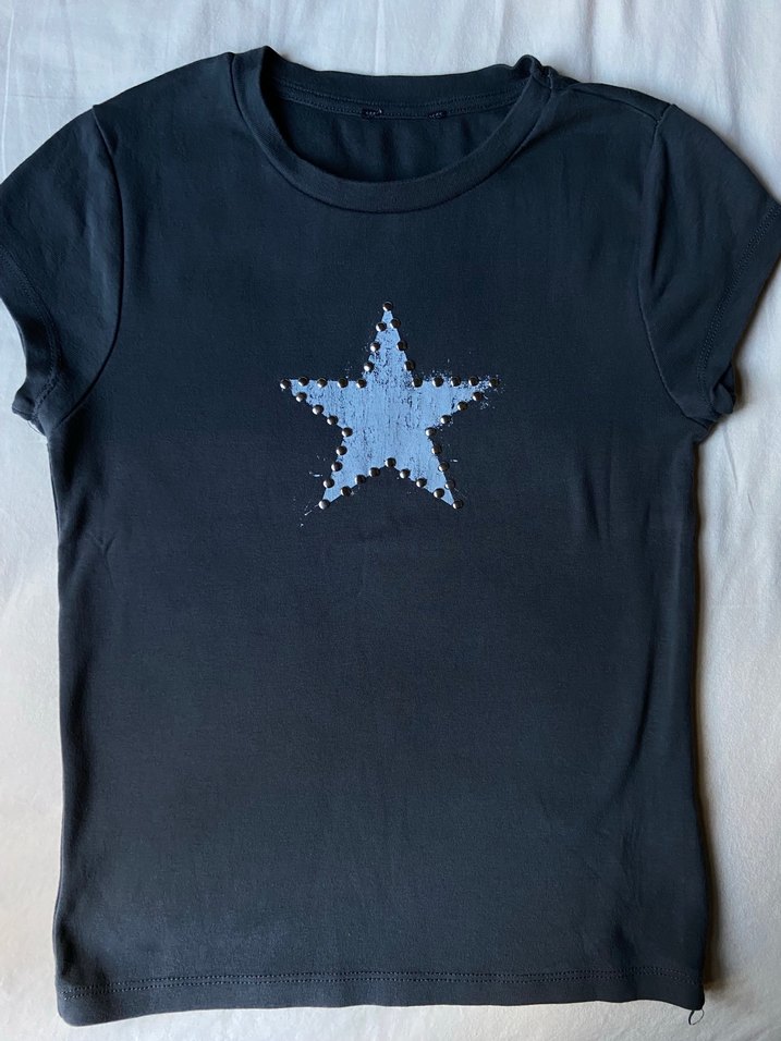 Lacivert denim görünümlü, önünde payetli yıldız baskısı olan kadınlar için kısa kollu, bisiklet yaka, fitted tişört. Rock punk tarzında.