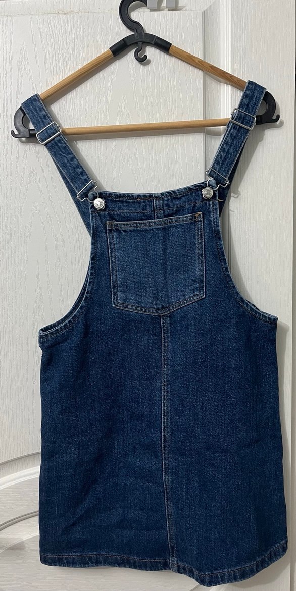 Lacivert renkli, tokalı askılı, midi boy, fitted kesim kadın denim kısa salopet. Kolsuz ve yuvarlak yaka, günlük rahat stil için uygundur.