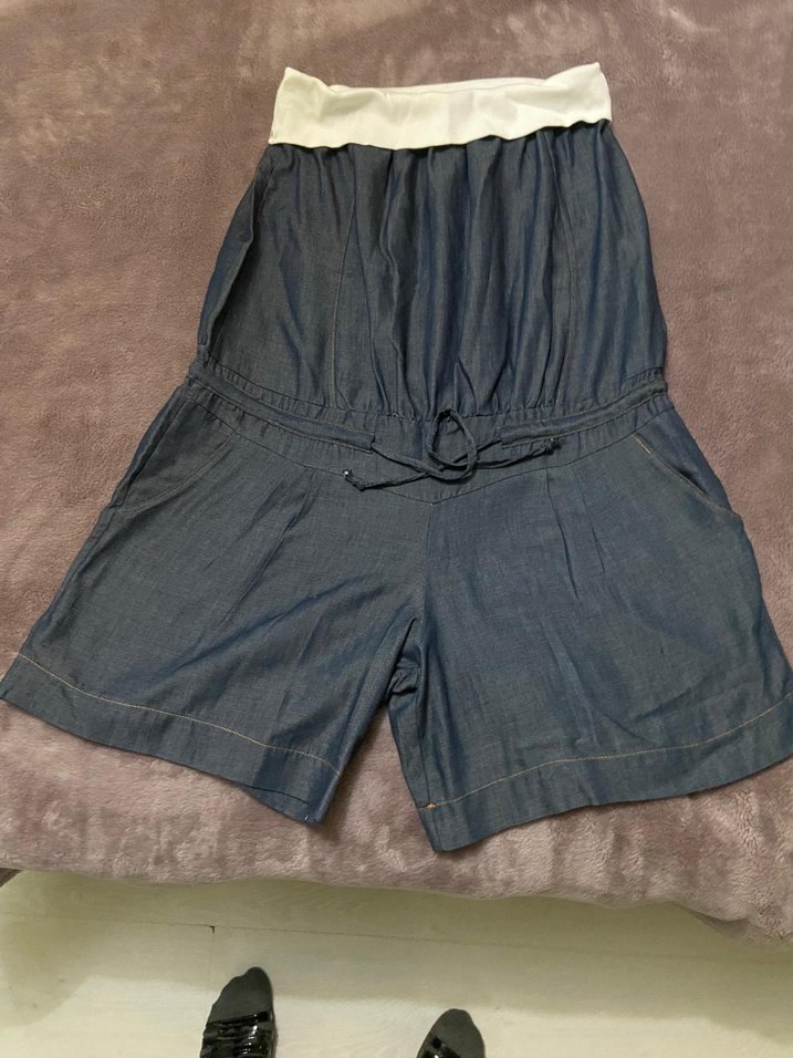 Lacivert denim kısa tulum, bol kesim ve kemerli bel ile. Kolsuz ve straplez tasarım, günlük dış mekan kullanımı için uygundur.