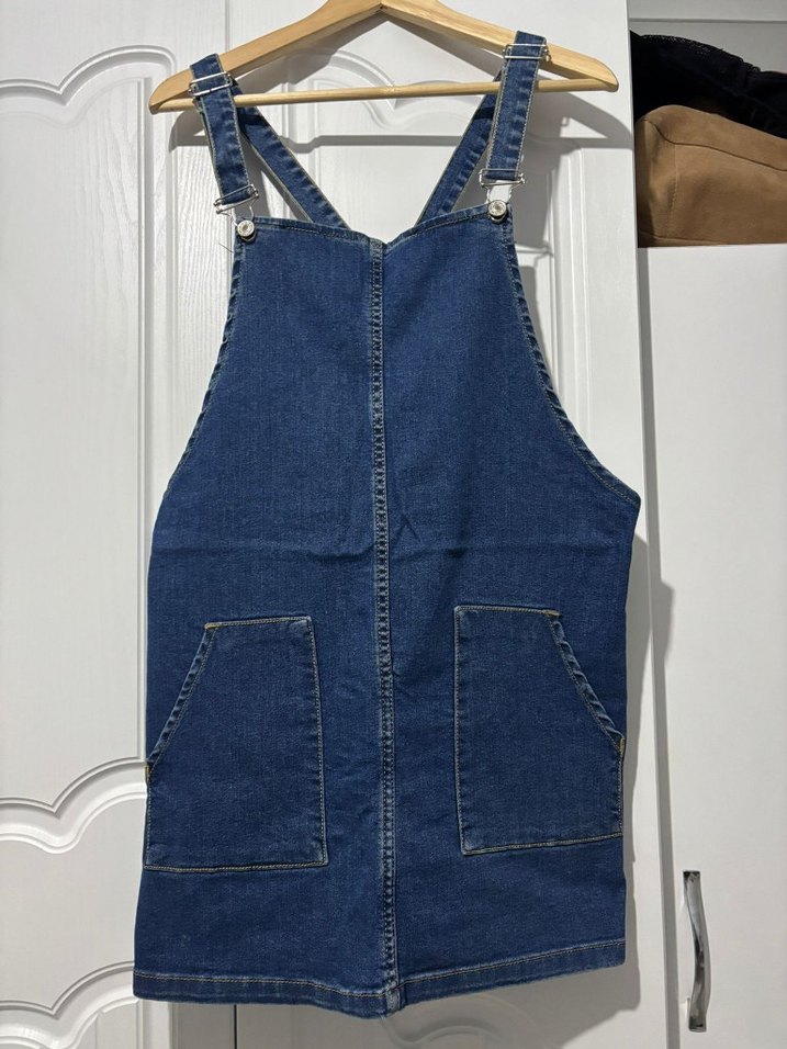 Lacivert denim kumaştan askılı, tokalı ve ön cepli, kadın midi elbise. Günlük kullanıma uygun şık seçim. 42bedene kadar uygundur