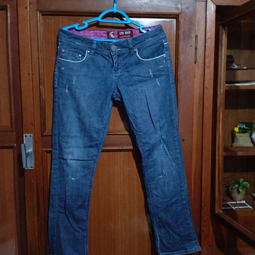 Kadınlar için koyu mavi denim kot pantolon, normal kesim ve midi boy. Tokalı detaylı, günlük kullanıma uygun rahat ve sokak stili.