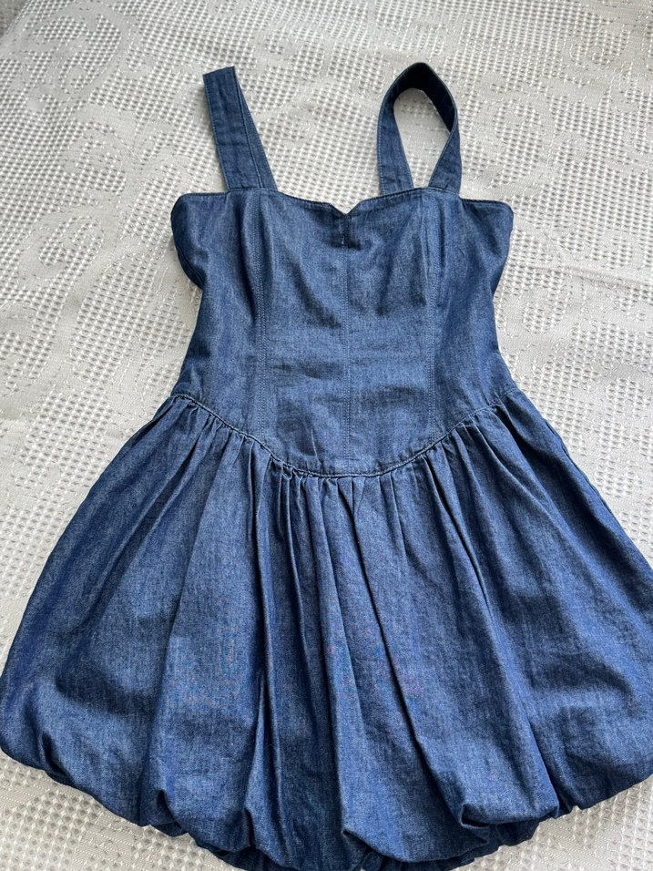 Lacivert denimden yapılmış, askılı, pileli ve straplez yakalı, vücuda oturan kadın midi salopet. Günlük kullanıma uygun normcore tarzda.