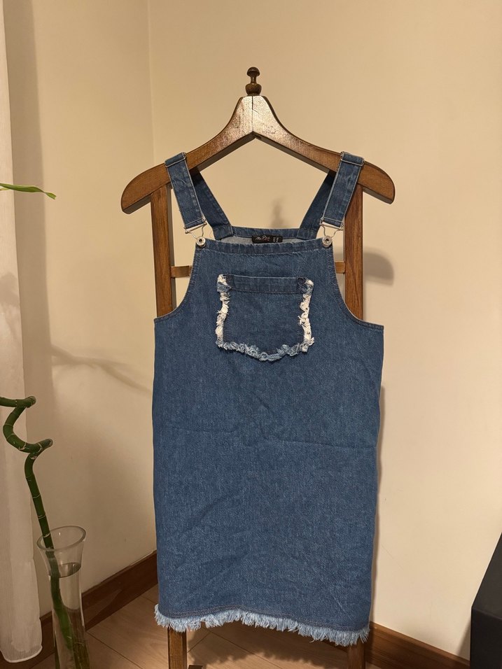Bu dar kesim lacivert denim midi salopet, ön cepte fırfır detaylar ve ayarlanabilir askılar içerir, günlük kullanım için uygundur.