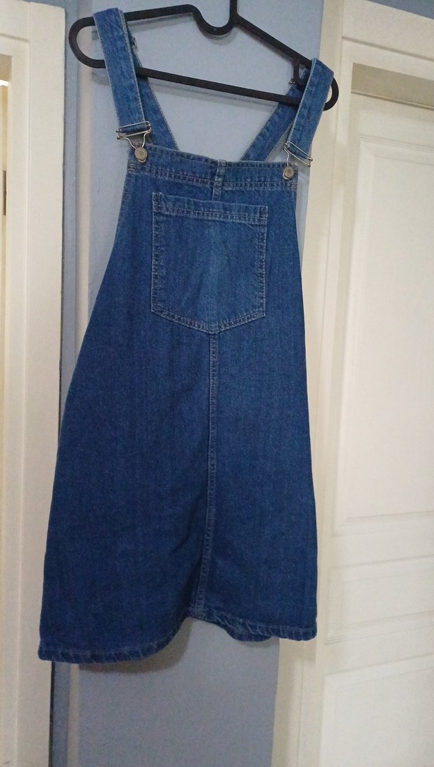 Lacivert denim midi boy, tokalı askılı, bol kesim kadın salopet. Ön cep ve yuvarlak yaka detaylarıyla günlük stil için uygun.