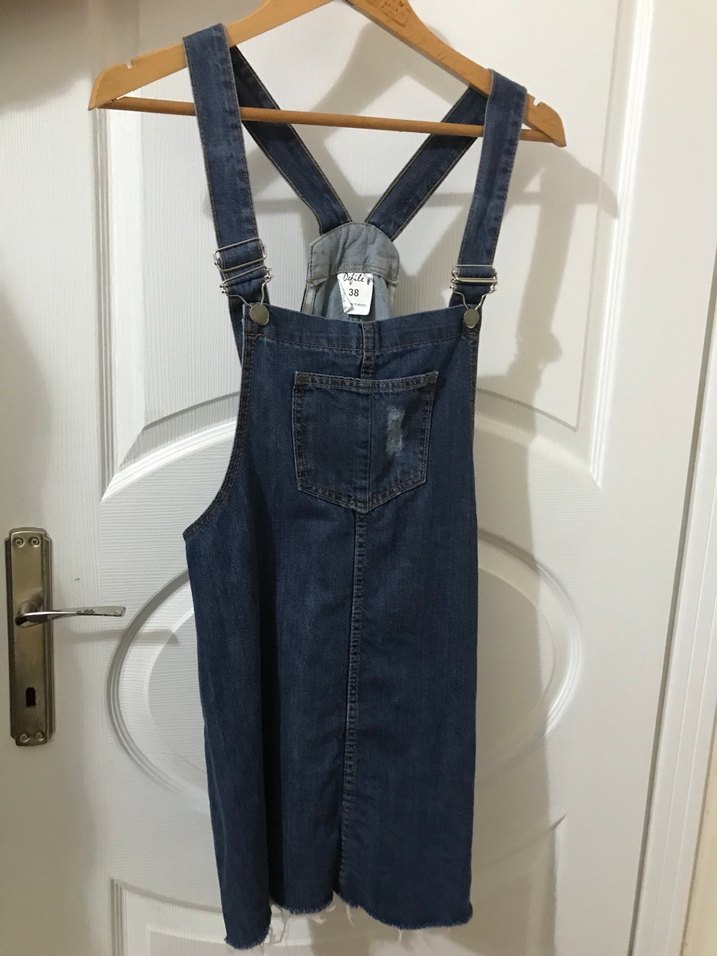 Bu lacivert denim midi salopet, tokalı askıları ve vücuda oturan kesimiyle gündelik sokak stiline uygundur. Ön cepli ve hafif yıpranmış kenarlara sahiptir.