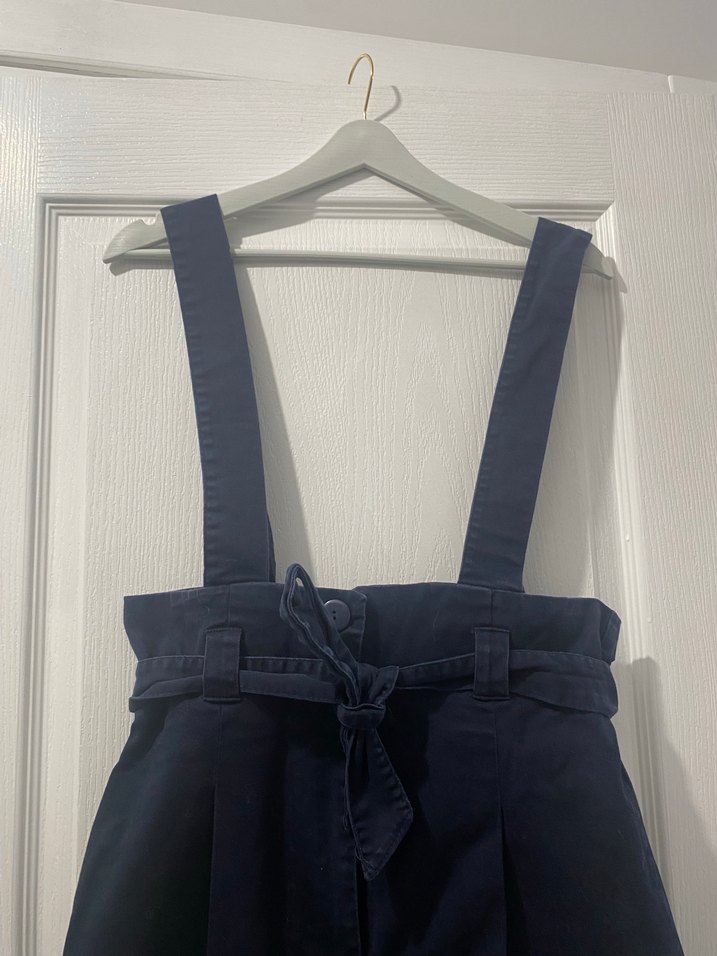 Lacivert denim midi tulum, askılı halter yaka ve bol kesim. Bel kemeriyle rahat ve şık, günlük kullanıma uygun.