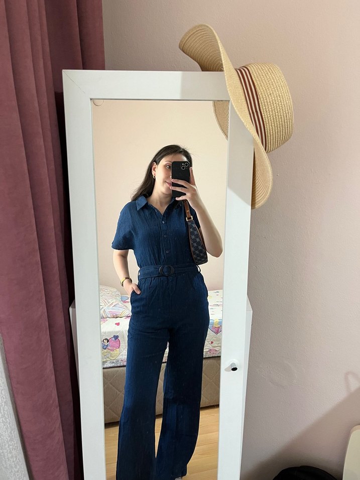 Lacivert denimden yapılmış, kısa kollu, yakalı ve regular kesim midi uzunlukta kadın tulumu. Günlük kullanıma uygun, zahmetsiz şıklık sunar. S bedendir yeni gibi çok giyilmedi kilo alımından dolayı satışa koydum