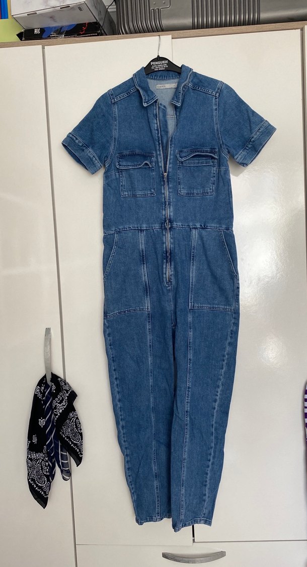 Lacivert denim kumaştan, kısa kollu ve çıtçıtlı yaka detaylı kadın midi tulum. Önden fermuarlı ve cepli, günlük rahat kullanıma uygun.
