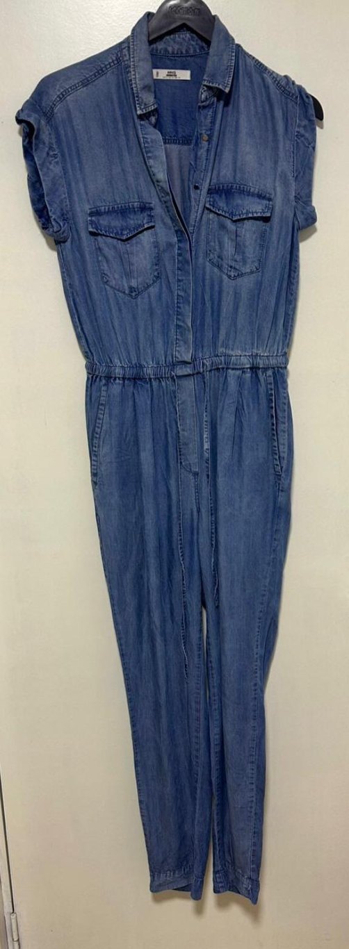 Kadınlar için lacivert gri tonlarında, belden kemerli, askılı kollu ve notlu yaka detayıyla rahat kesim midi uzunlukta denim tulum. Günlük kullanıma uygundur.