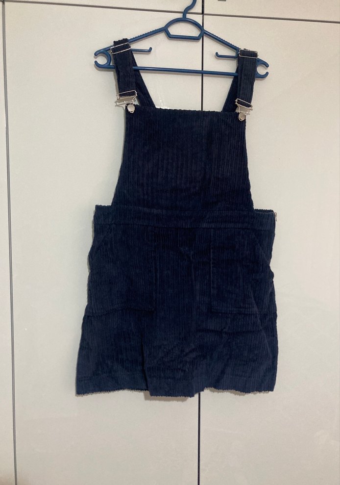 Lacivert denimden yapılmış, askılı ve tokalı, yüksek yakalı, vücuda oturan kısa salopet.