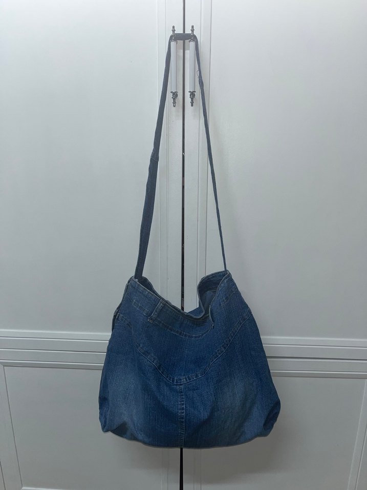 Lacivert denim omuz çantası, tokalı askıya sahip, minimalist ve desensiz tasarımıyla günlük rahat kullanıma uygundur. Sokak stili için ideal.