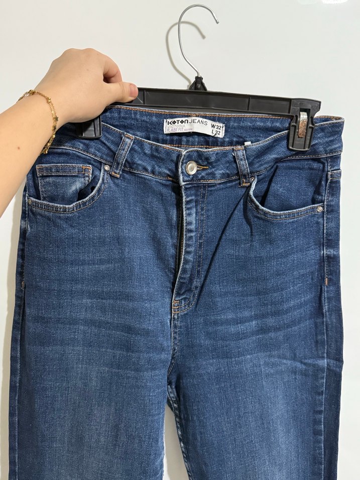 Kadınlar için lacivert renkli, yüksek bel boy fit kesim kot pantolon. Minimalist ve normcore tarzda, günlük kullanıma uygun, tokalı detaylı.