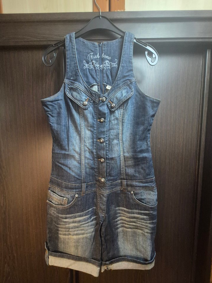 Lacivert denim kumaştan, askısız ve kemerli, düğmeli detaylara sahip şort tulum. Günlük kullanıma uygun, sokak modasına uygun rahat bir tasarım. Fishbone markası. M bedendir. Hiçbir kusuru yok max 1 2 kere giyilmiştir.