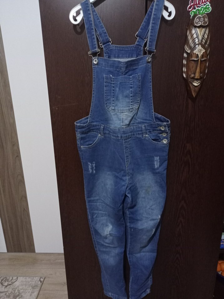 Ayarlanabilir tokalı askıları, regular kesimi ve bisiklet yaka stiliyle lacivert denim tulum. Günlük rahat sokak giyimi için uygun.