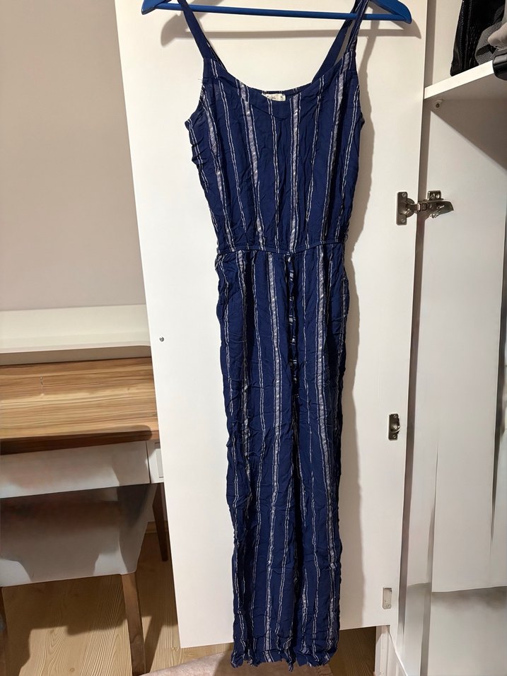 Lacivert denim, uzun ve vücuda oturan tulum. İnce askılı, V yaka . Bohem tarzda batik desenli, günlük kullanım için uygun.