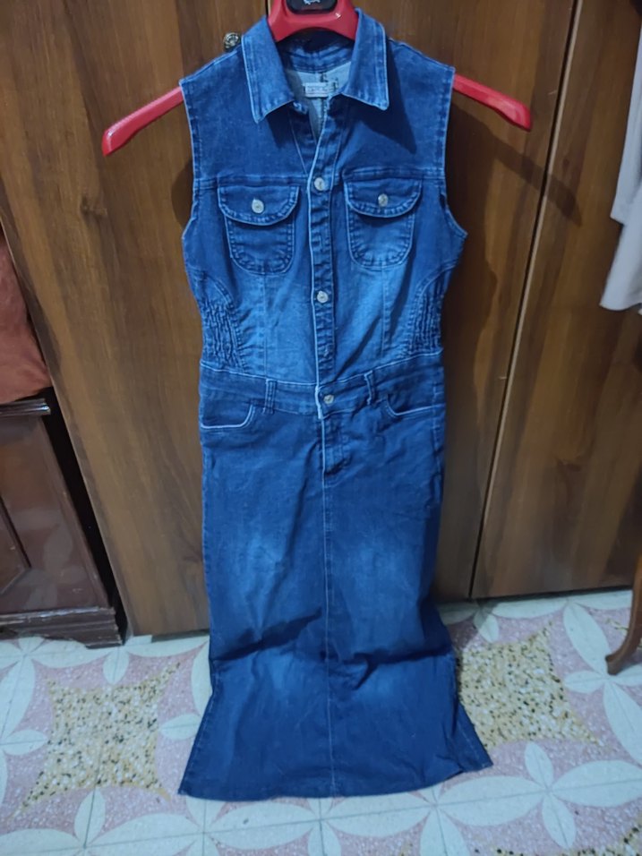 Lacivert denim kumaştan, kolsuz, yaka detaylı ve kemerli uzun jile elbise. günlük sokak stiline uygun. M beden 38