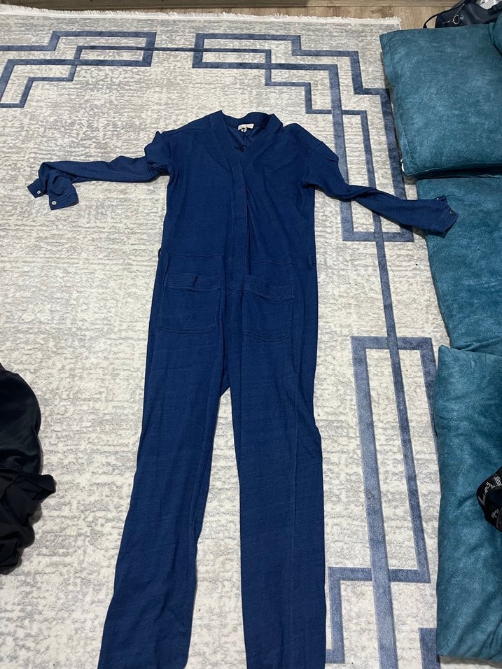 Lacivert denim kumaştan, uzun kollu ve yakası kesik detaylı, dar kesim kadın tulumu. Günlük sokak stili için sade ve şık tasarım.