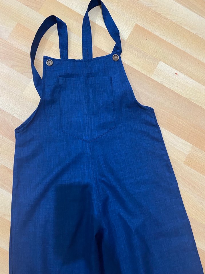 Kadınlar için lacivert denimden yapılmış, düğmeli askılı, kolsuz ve midi boyda normal kesim salopet. Minimalist ve sade tarzda, günlük kullanıma uygun. ✨