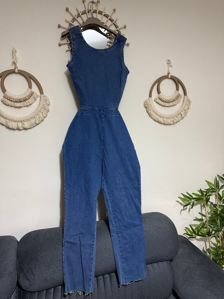 Kadın lacivert denim tulum, kolsuz ve yuvarlak yakalıdır. Regular fit ve uzun kesimiyle rahat, desen içermeyen sokak stili sunar. Günlük kullanım için şık ve rahat bir seçimdir.